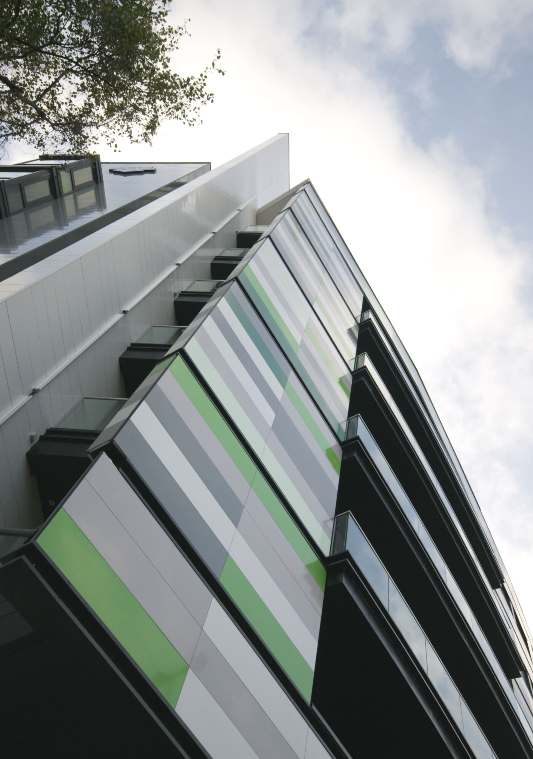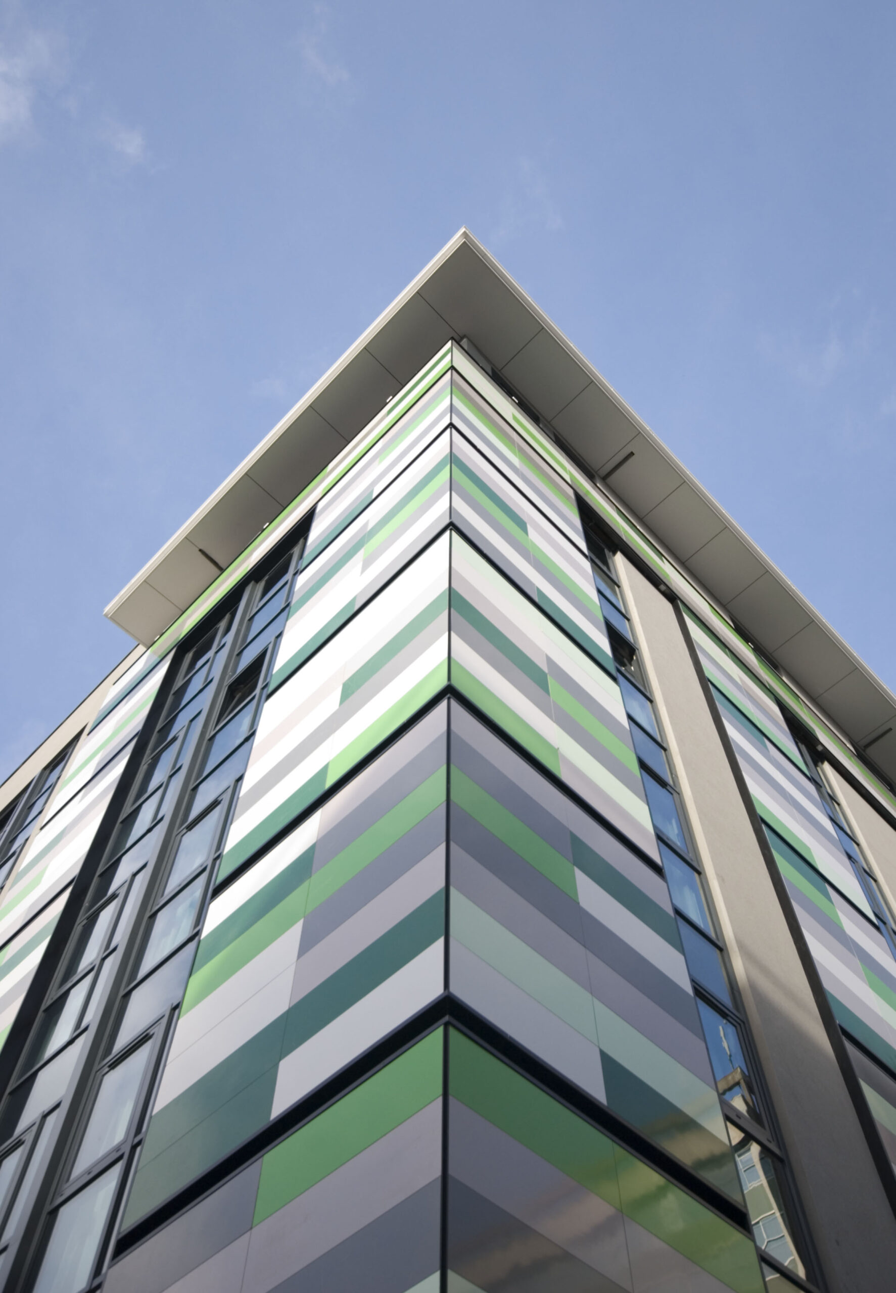 Le système de parement permet une finition nette et sur mesure de chaque élément et chaque plan, tandis que le rendu lisse de la couche secondaire crée un contraste avec le fond neutre. Vu l’usage du bâtiment et son lien avec une organisation qui se consacre aux enfants, l’usage de la couleur a été soigneusement étudié, aussi bien en termes d’esthétiques que pour son effet psychologique. Huit coloris différents du système de parement Carea ont été choisis pour l’extérieur : trois verts, trois gris, un blanc et un noir. Les couleurs, fournies avec différentes finitions mates et brillantes, ont été recréées de façon à correspondre à des couleurs RAL spécifiées. Les verts ont été choisis pour leur association à la nature et leur propriété apaisante, tandis que les tons gris et argent sont rassurants, neutres, et enrichissent la substance du revêtement. L’introduction de la couleur crée un bâtiment très vivant, doté d’une identité unique à laquelle l’organisation tient beaucoup dans son programme national de construction.