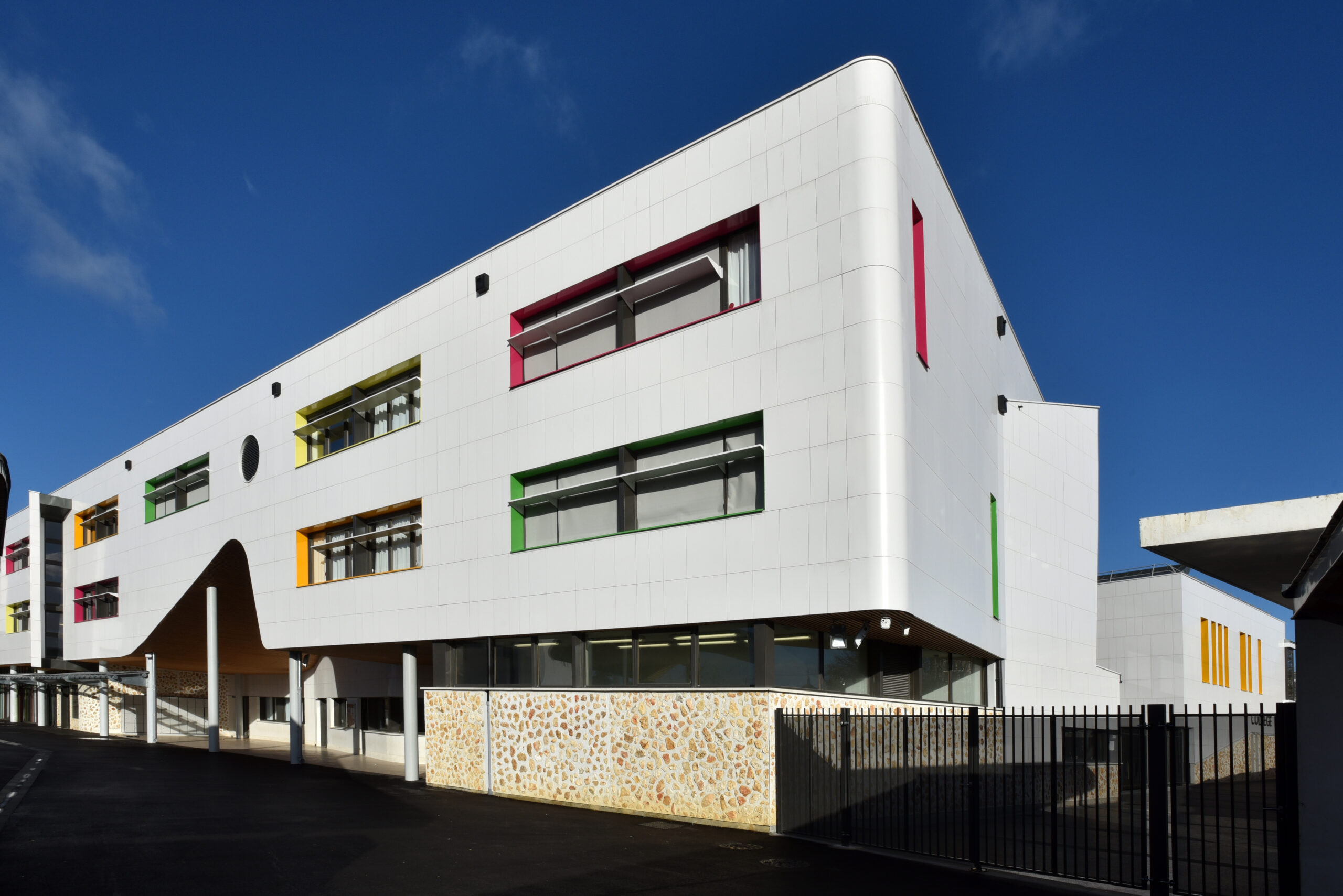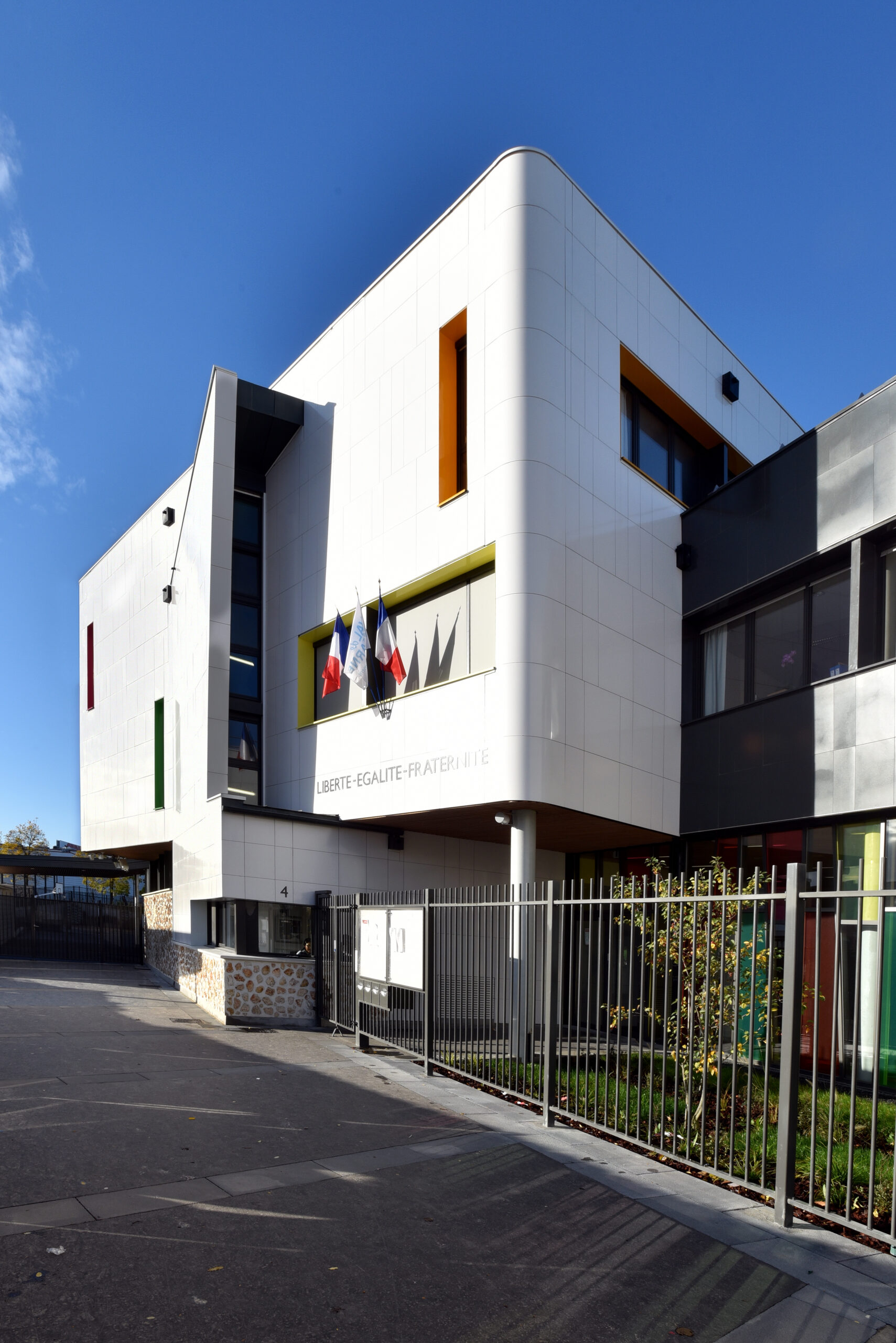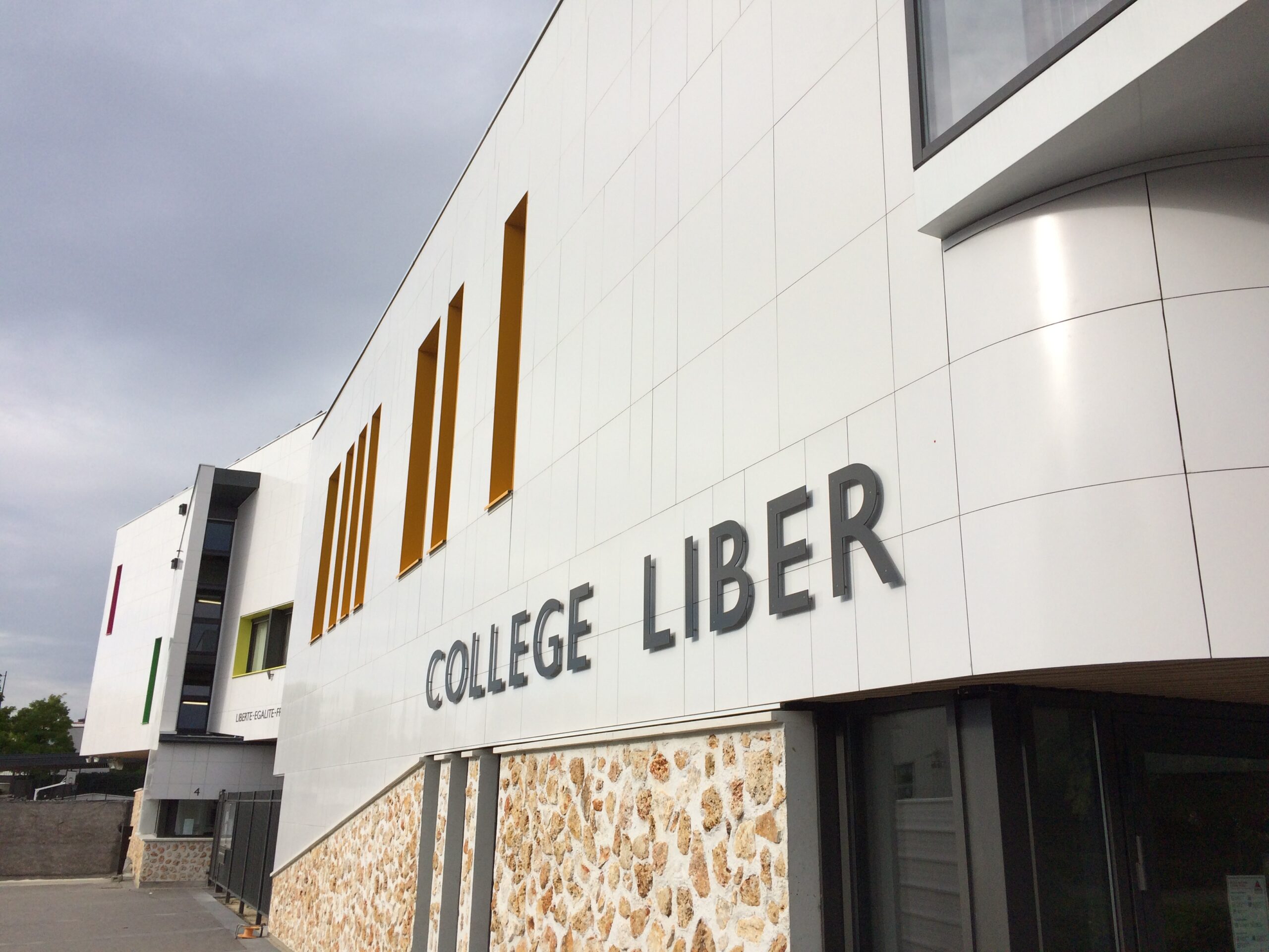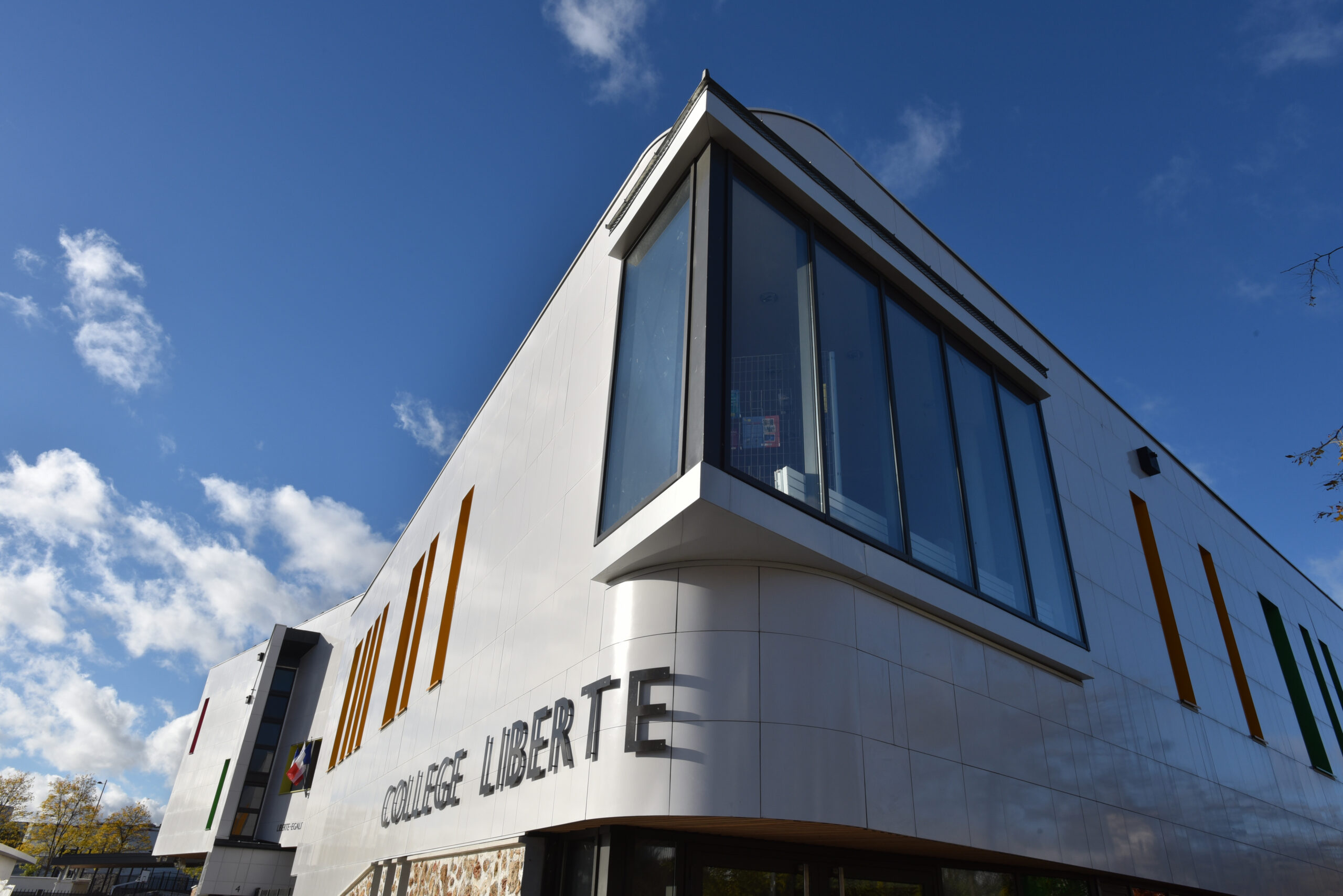 Le collège Liberté, à Chevilly-Larue, a été bardé à l’aide des parements de façade LISSE BRILLANT et PAPYRUS (papier froissé), employés ici en bardage avec ossature (BAO).