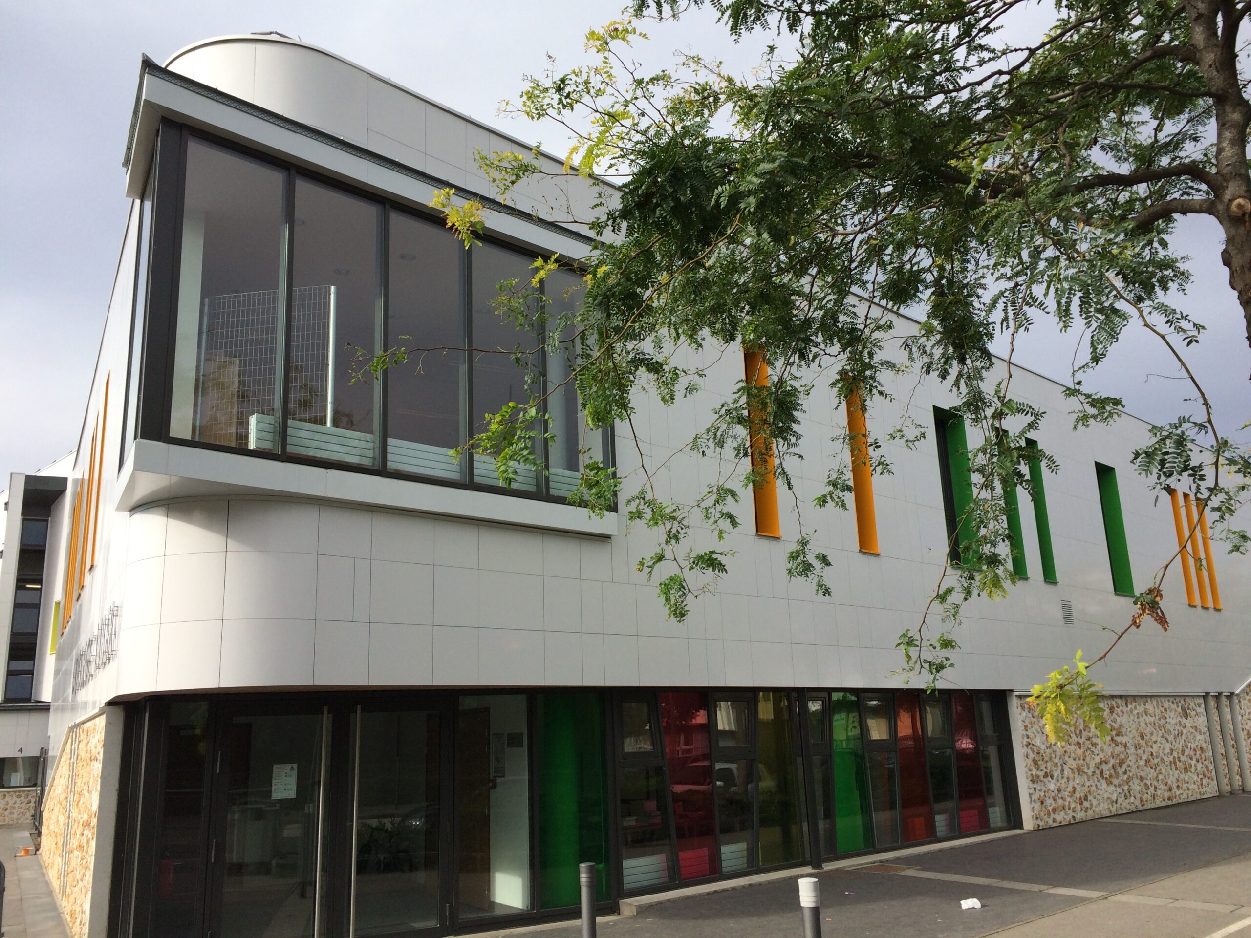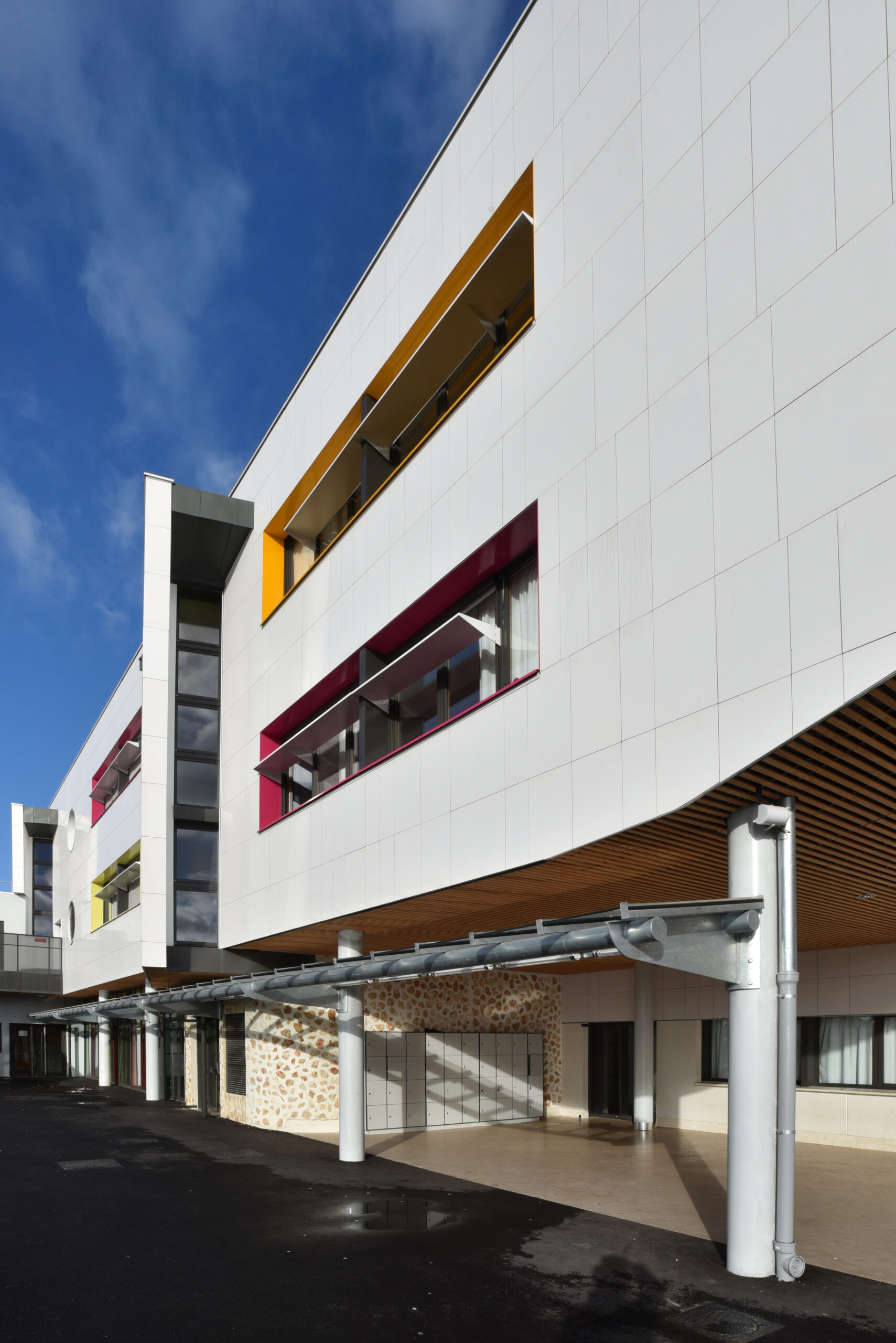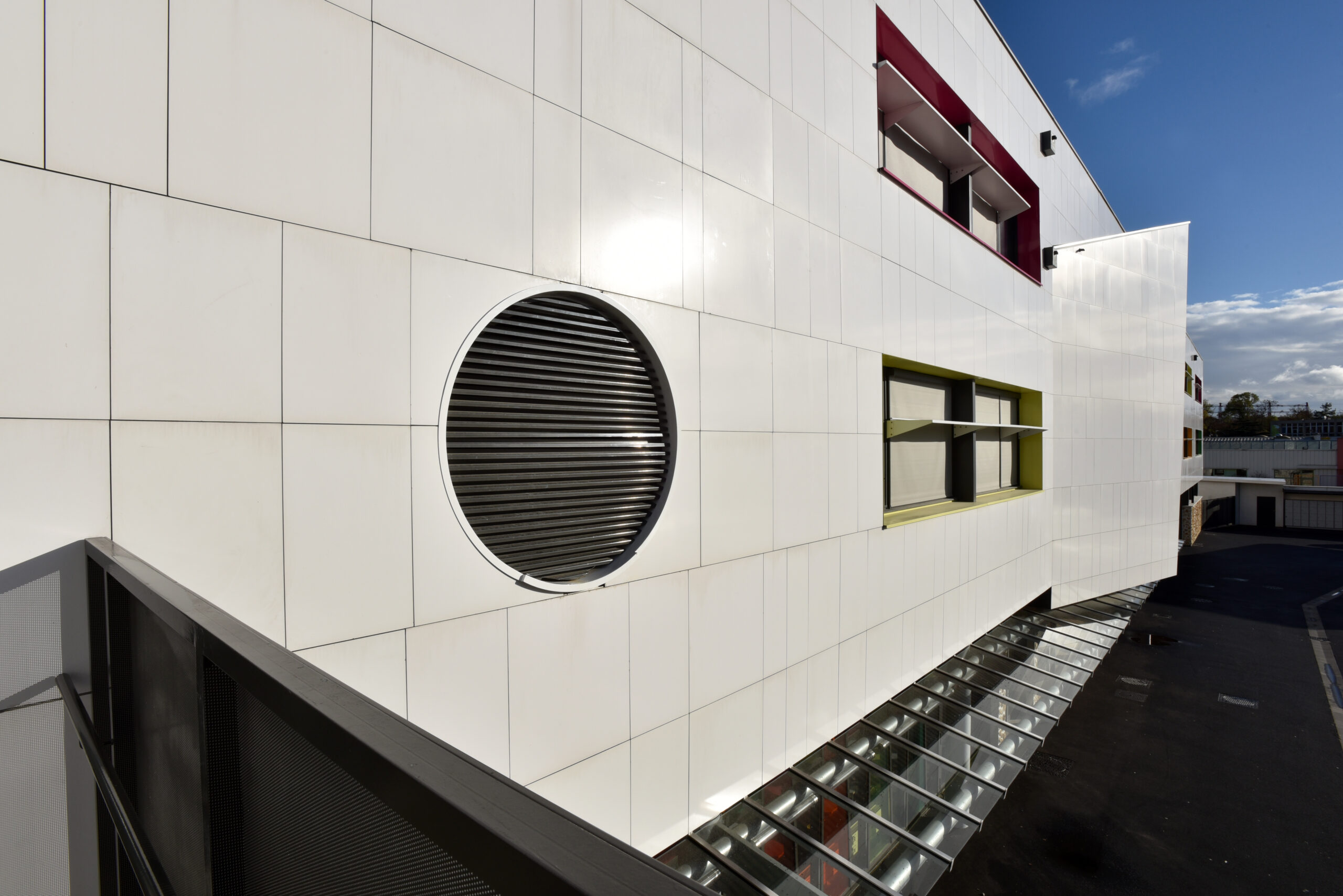 Le collège Liberté, à Chevilly-Larue, a été bardé à l’aide des parements de façade LISSE BRILLANT et PAPYRUS (papier froissé), employés ici en bardage avec ossature (BAO).