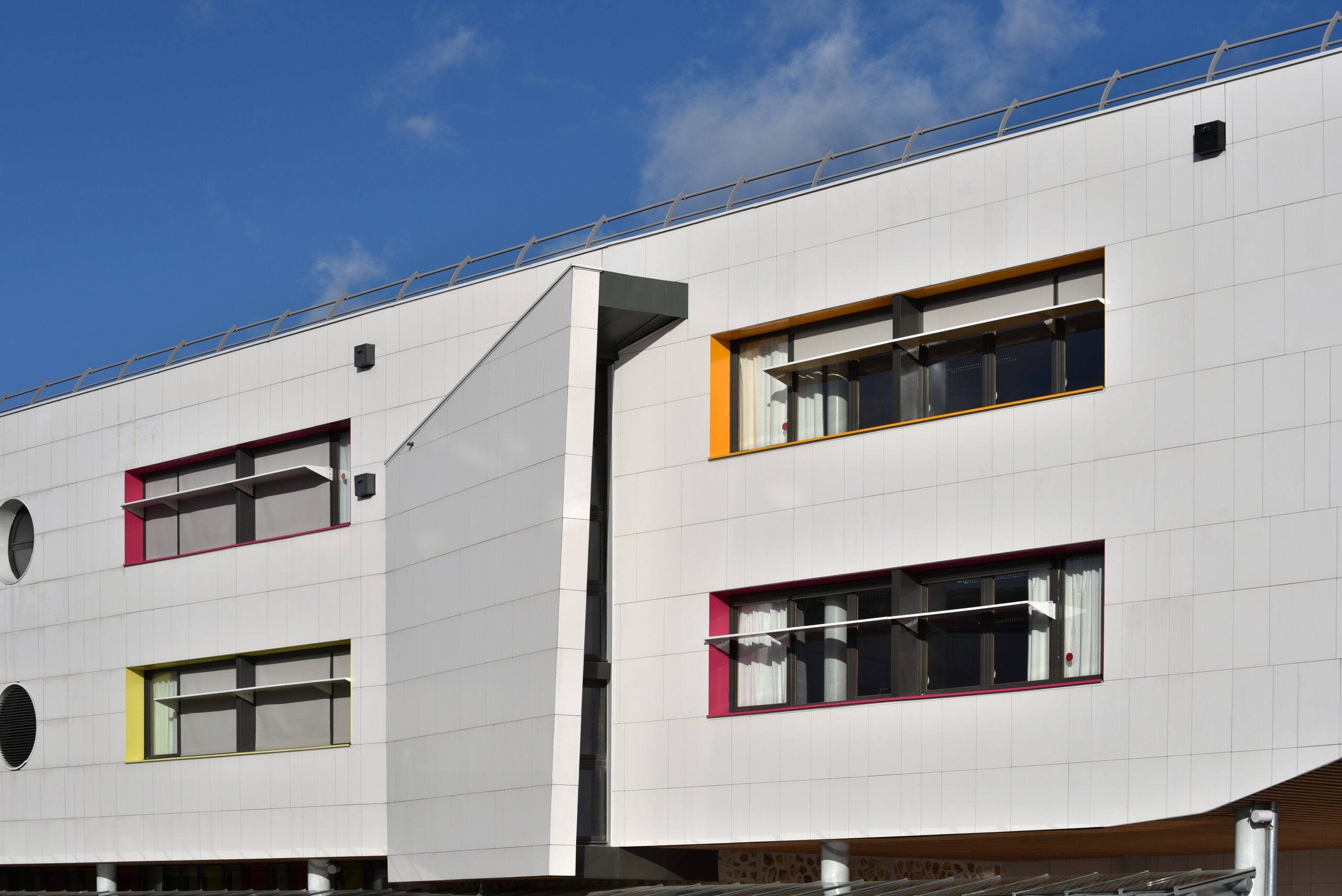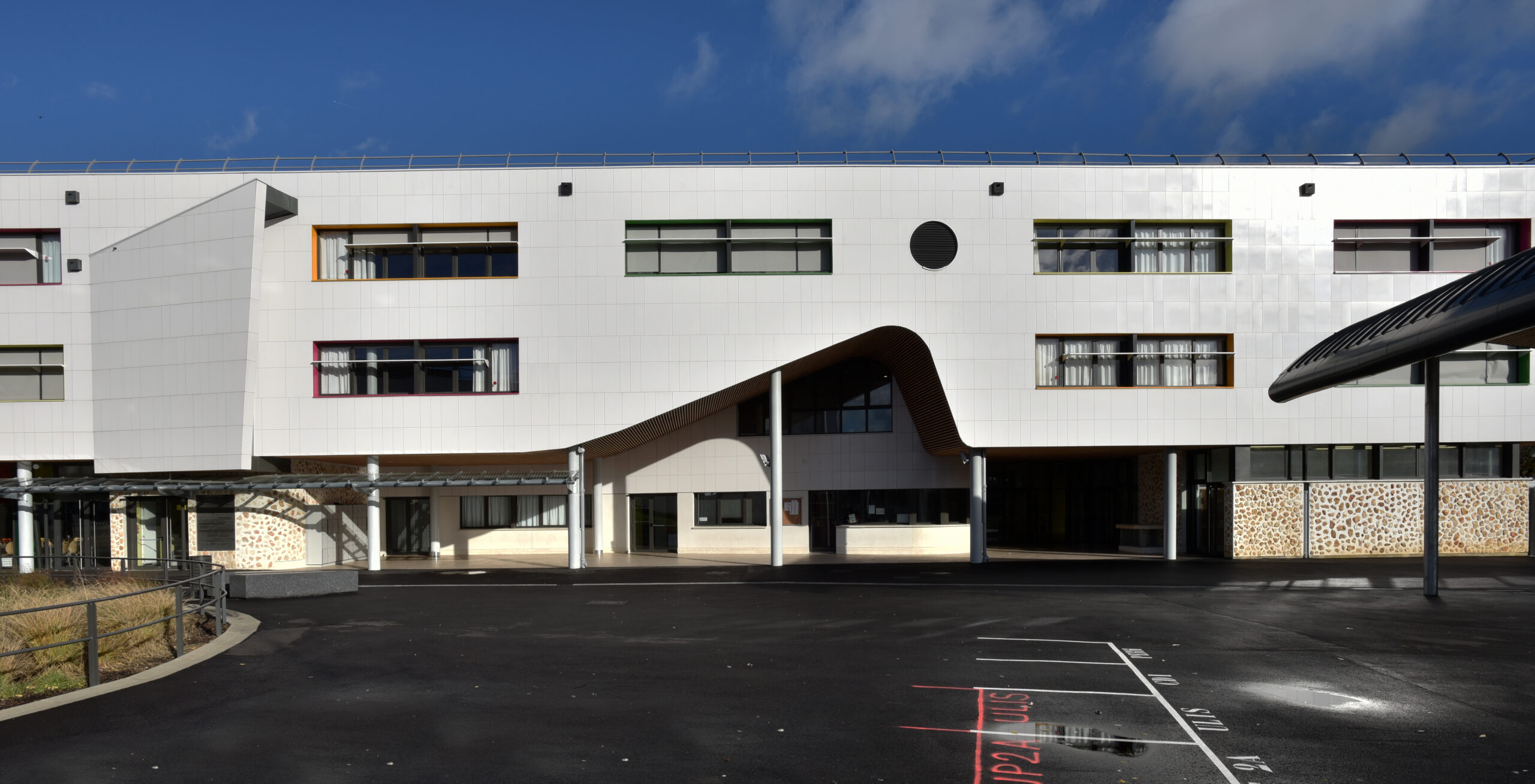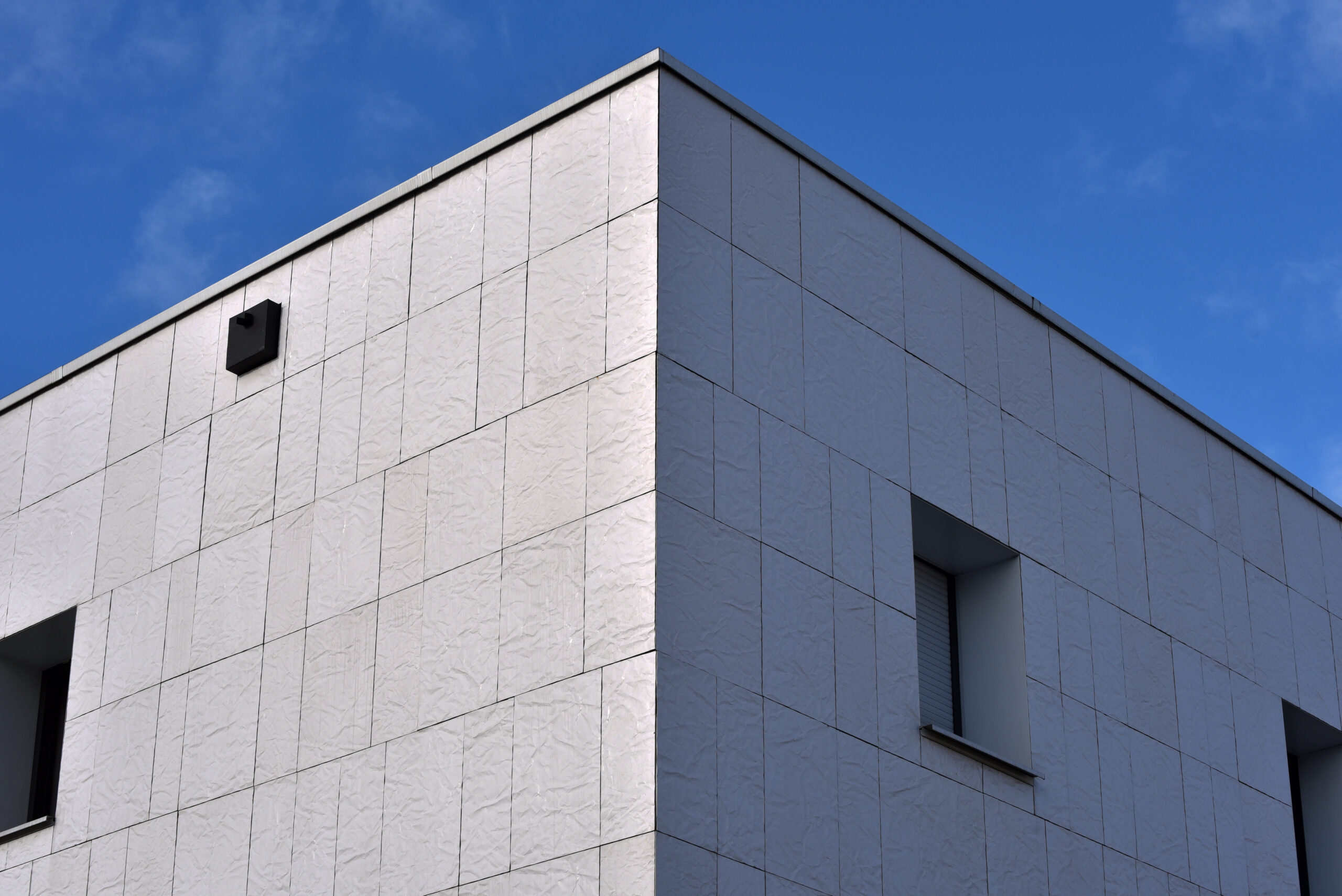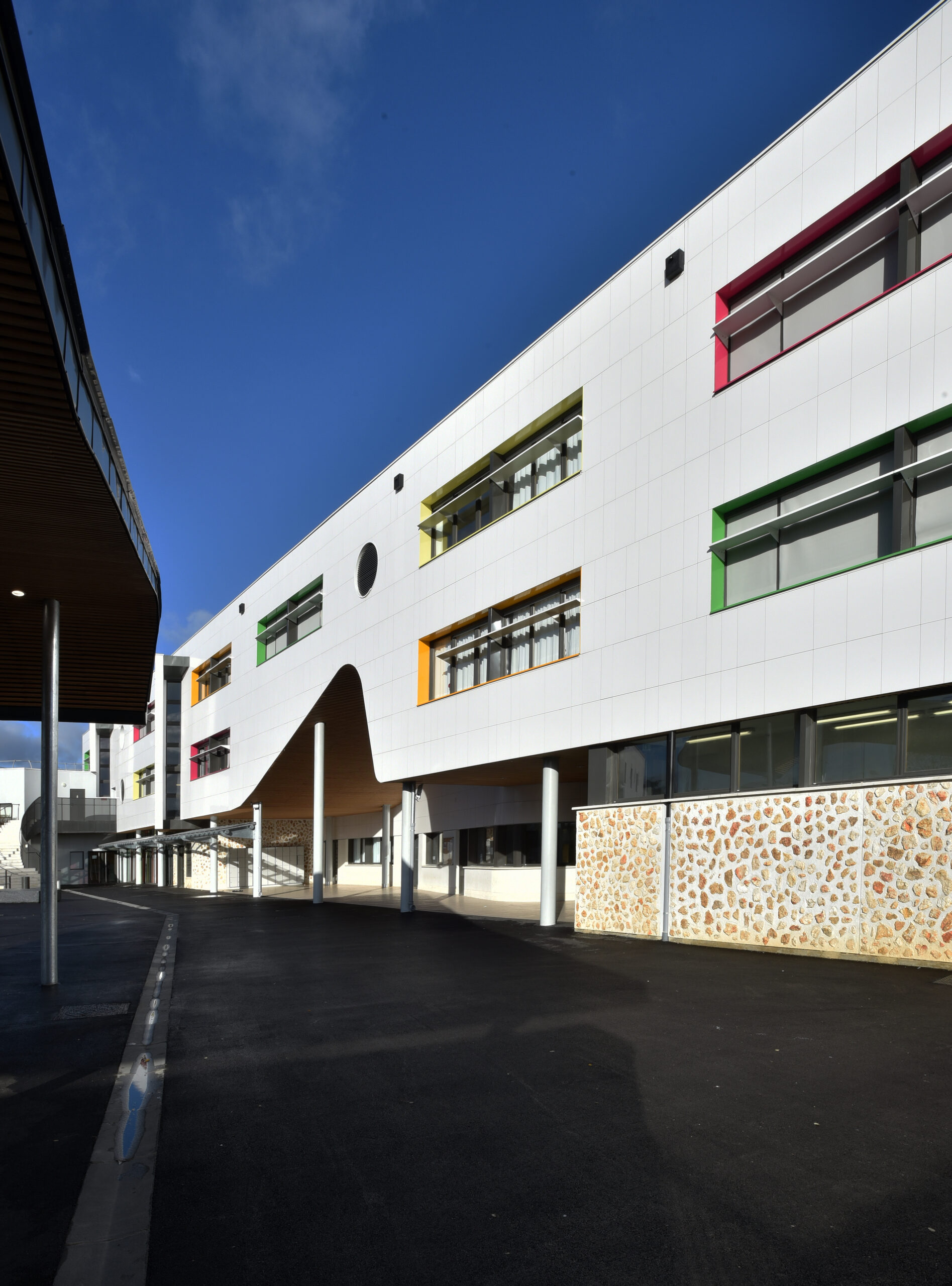 Le collège Liberté, à Chevilly-Larue, a été bardé à l’aide des parements de façade LISSE BRILLANT et PAPYRUS (papier froissé), employés ici en bardage avec ossature (BAO).