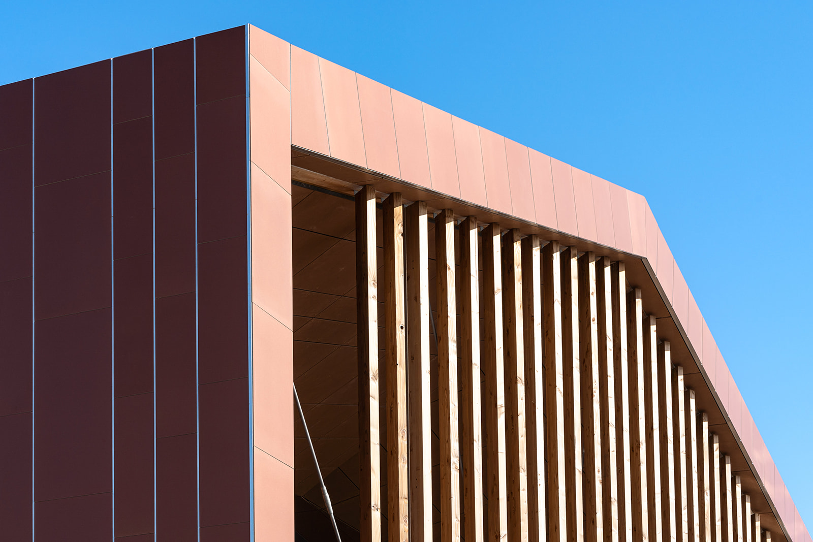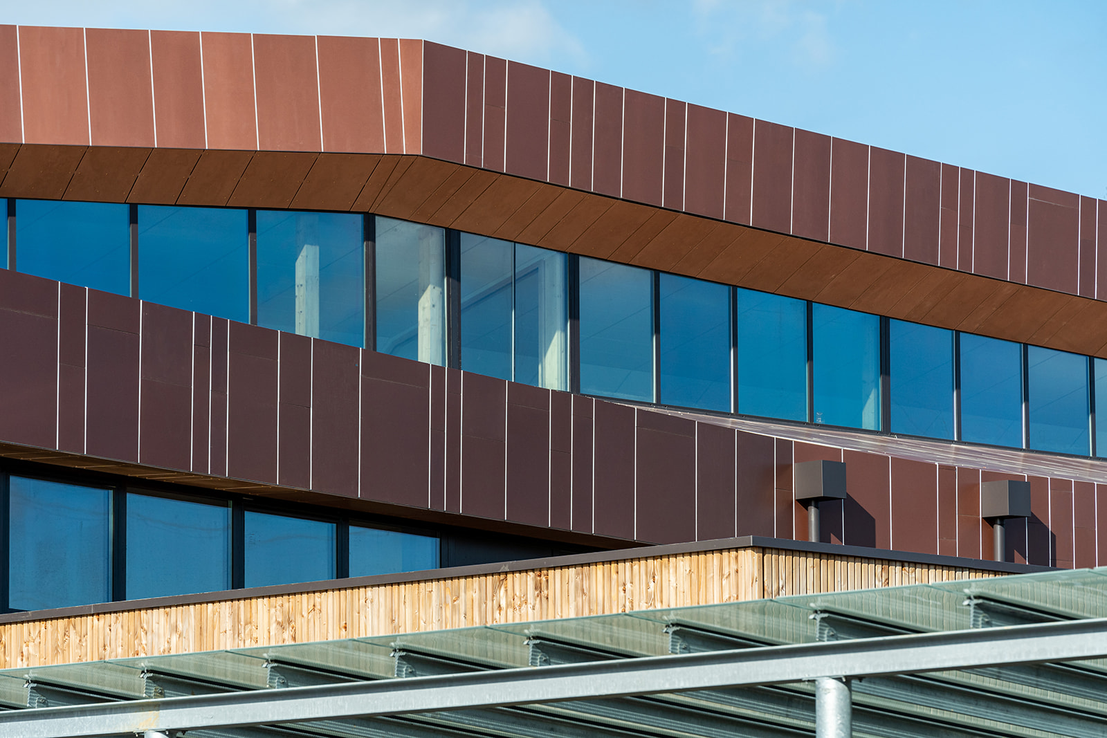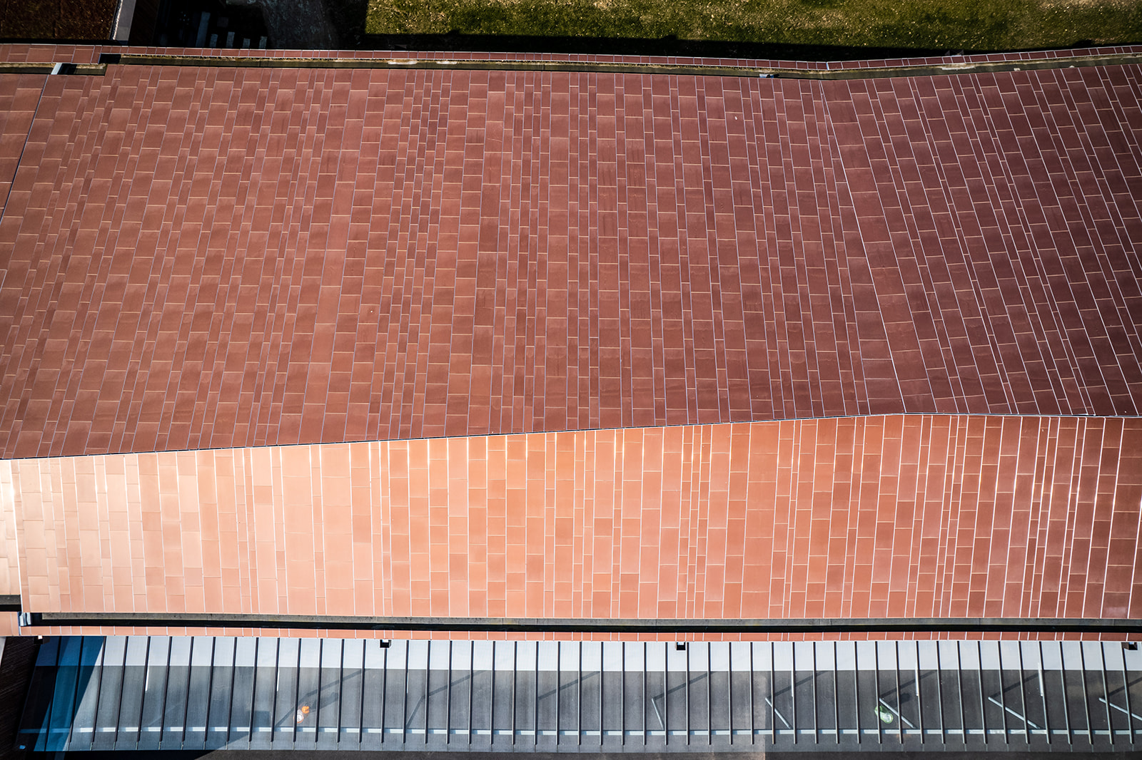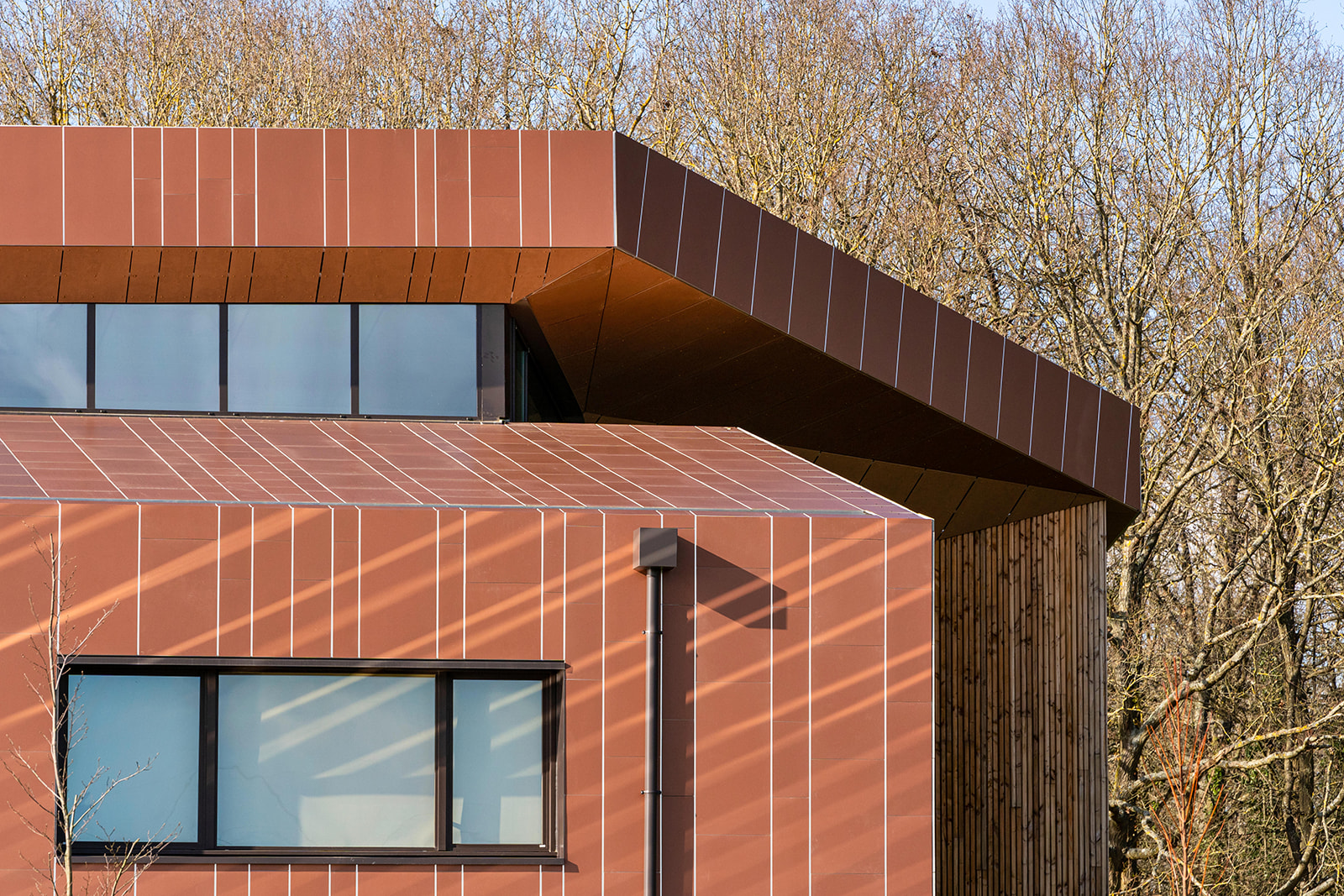 L’architecte souhaitant le prolongement de l’aspect cuivre sur la cinquième façade, les mêmes parements ont donc été employés en surtoiture, après une étude de faisabilité du bureau d’étude CAREA et son accompagnement dans les suggestions techniques et la validation du système.
