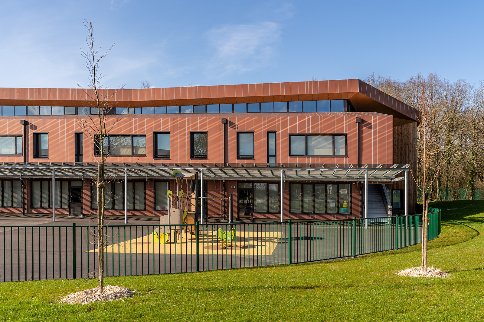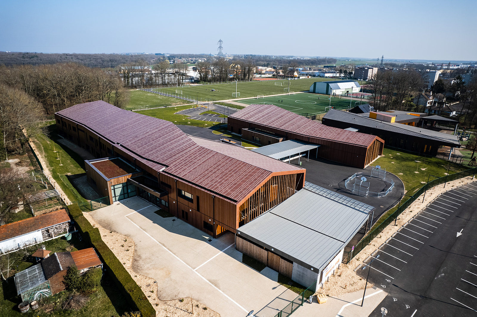 Situé dans un environnement verdoyant, le long de la rue du bois des Communes, l’établissement se connecte aux équipements pré-existants (accueil périscolaire et plateau sportif) et a été conçu avec un maximum de matériaux naturels et les dernières avancées technologiques en matière d’éco-construction, avec des matériaux biosourcés pour l’isolation ou géosourcés pour la façade. Ce qui permet au bâtiment une basse consommation énergétique et garantit par la même occasion le confort et la santé des jeunes élèves.