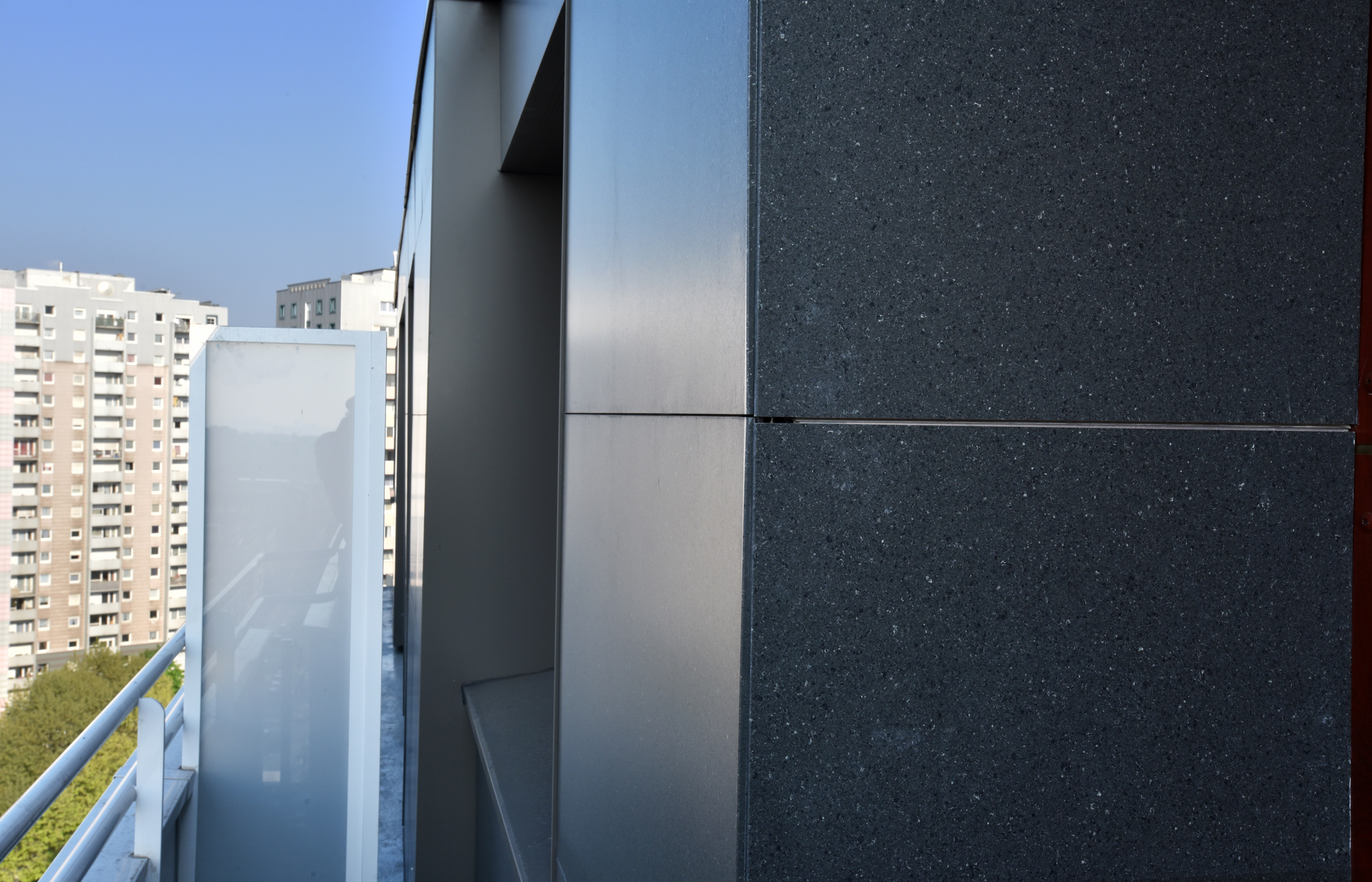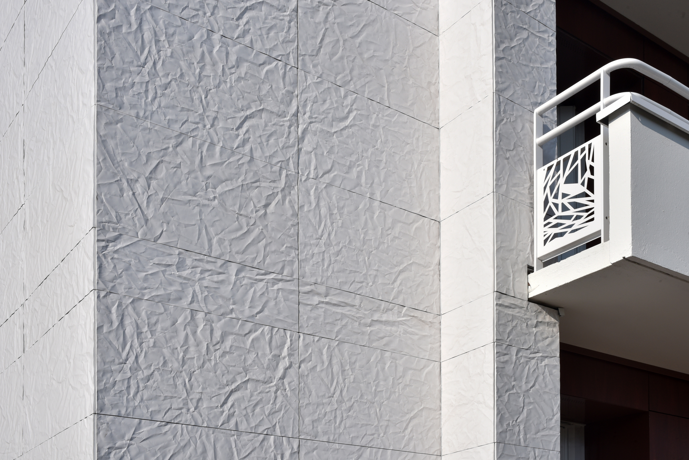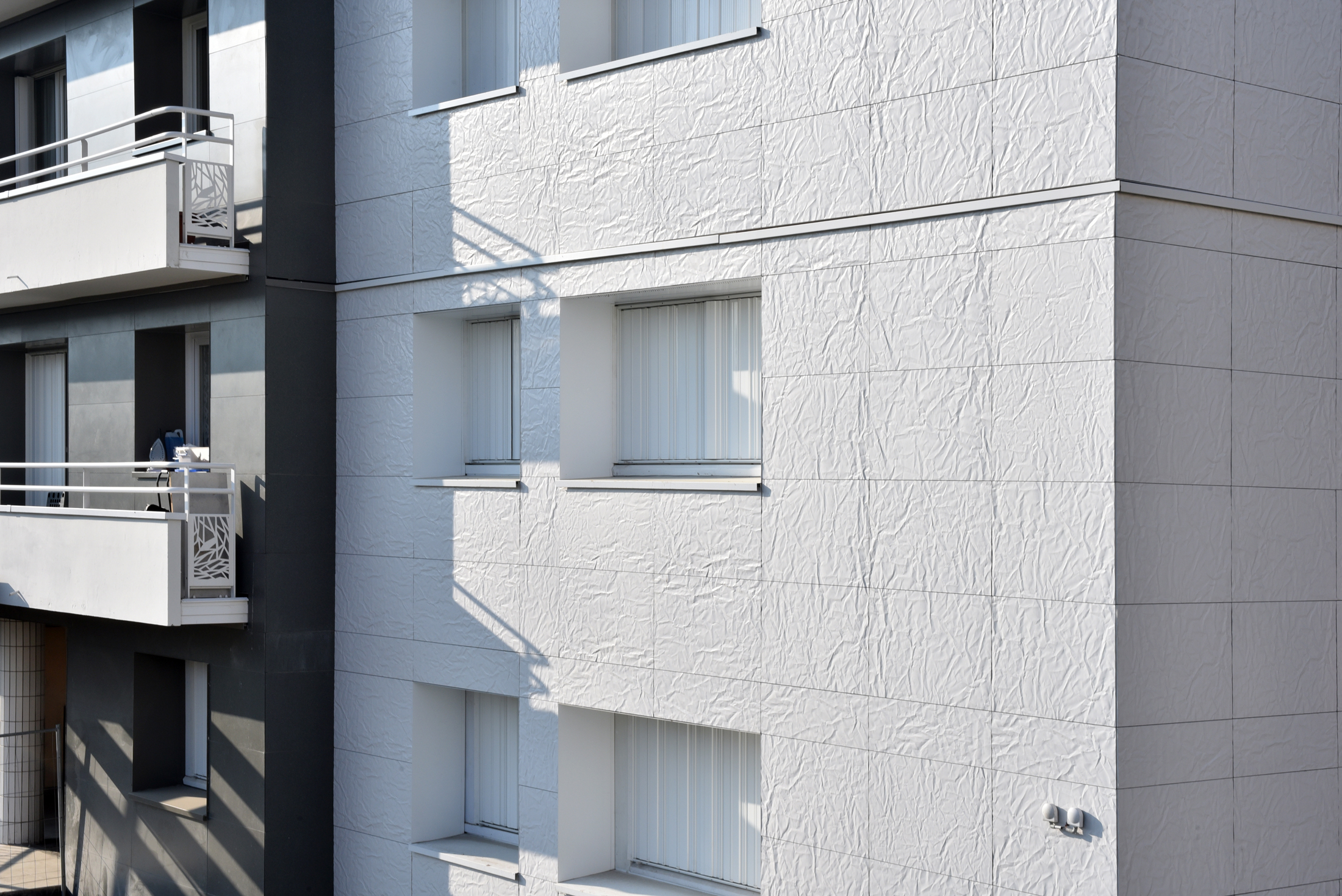 En effet, l’utilisation de ce système unique offrant des esthétiques bien différentes, permet une rénovation simplifiée et se distingue des projets de logements traités de façon plus monolithique en façade. Avec le Papier froissé blanc et le Lisse Gris basalte, il a été possible pour l’architecte de mixer différents aspects et textures, tout en conservant l’esprit minéral du granit à base de quartz.