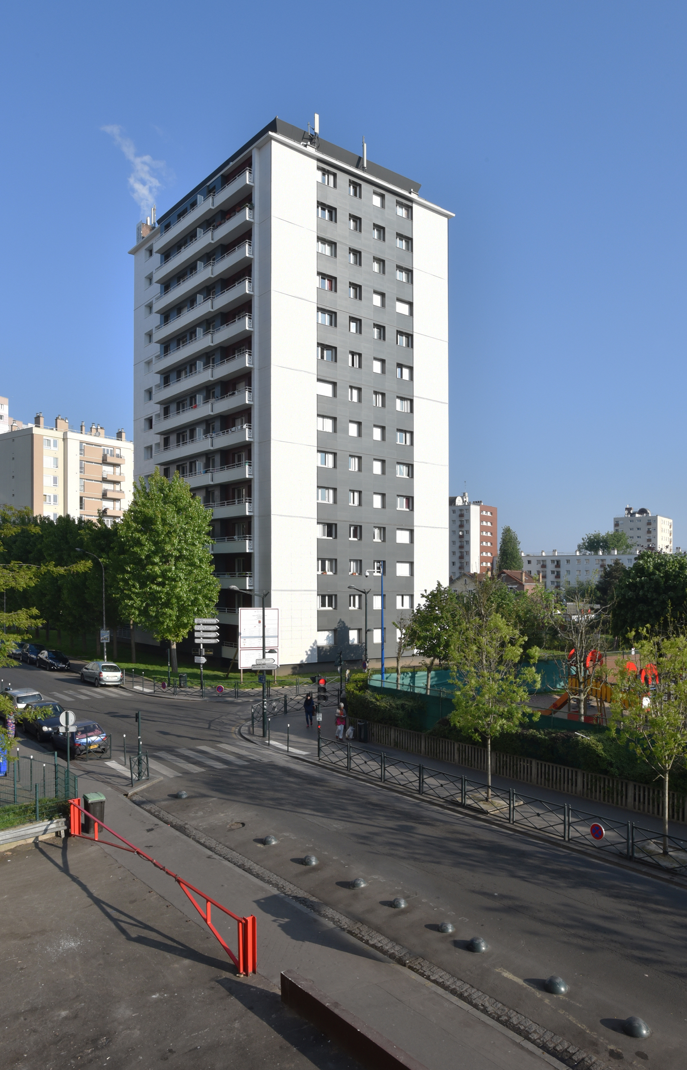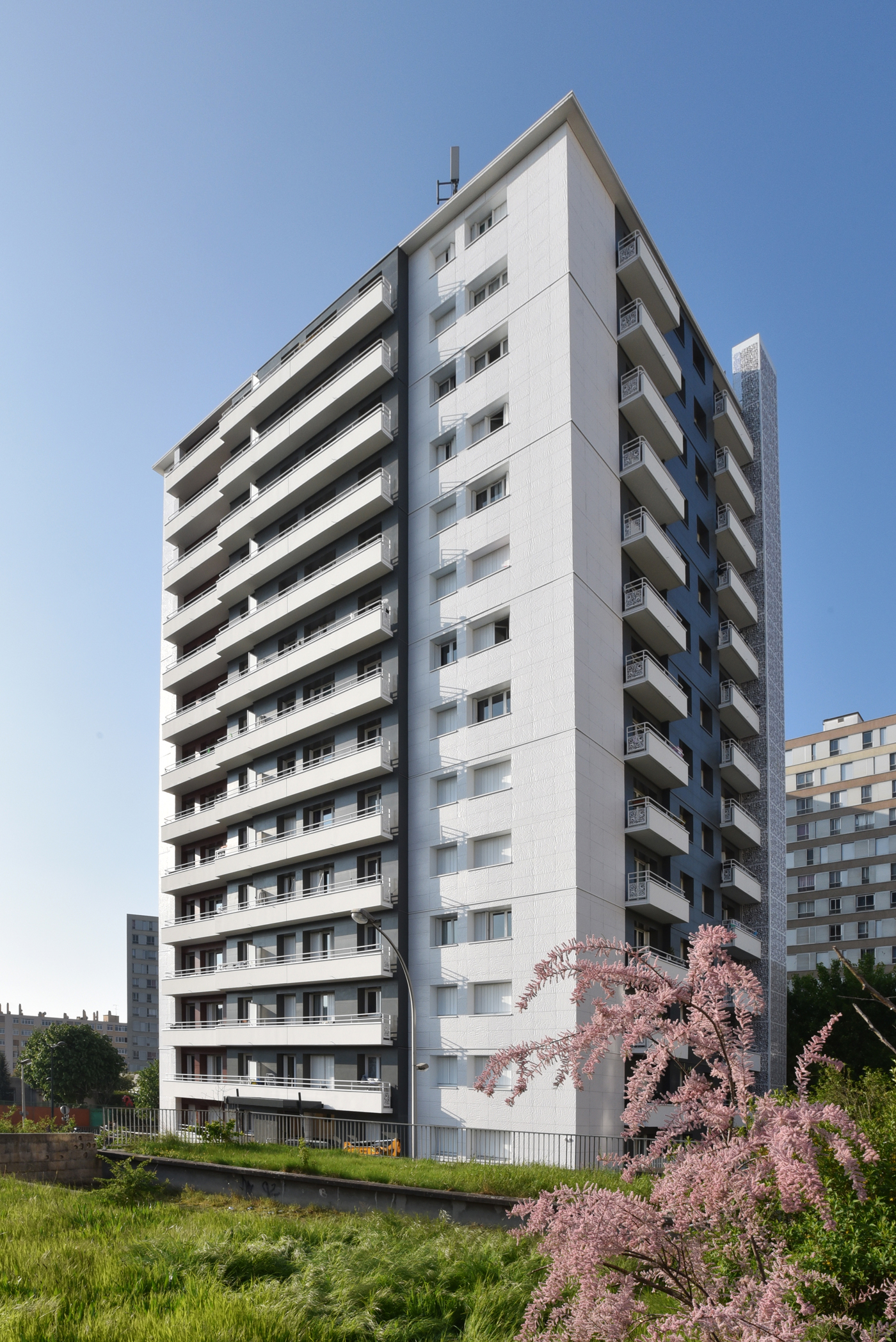 Il s’agit d’une réhabilitation thermique de 84 logements, avec mise en œuvre d’un habillage des façades, mise aux normes de la ventilation dans les logements, et remplacement de la clôture existante de résidentialisation par une clôture rigide sur muret en béton.