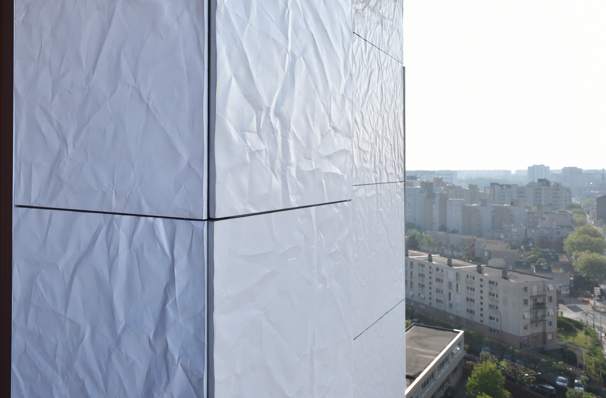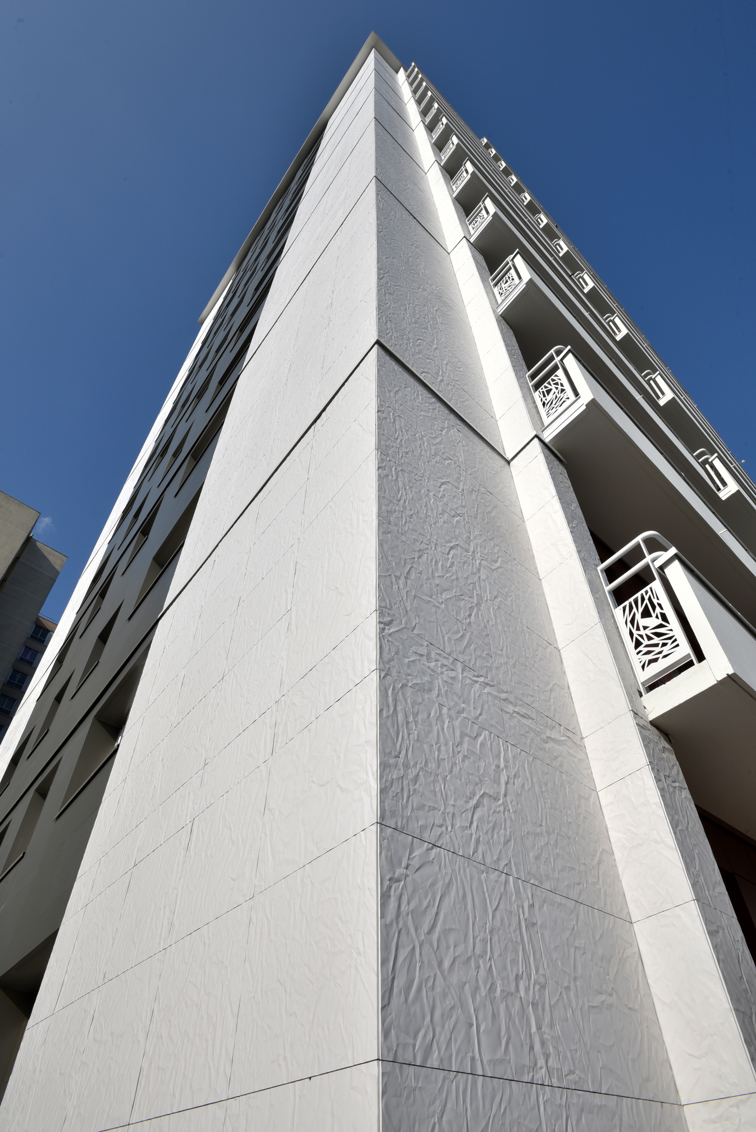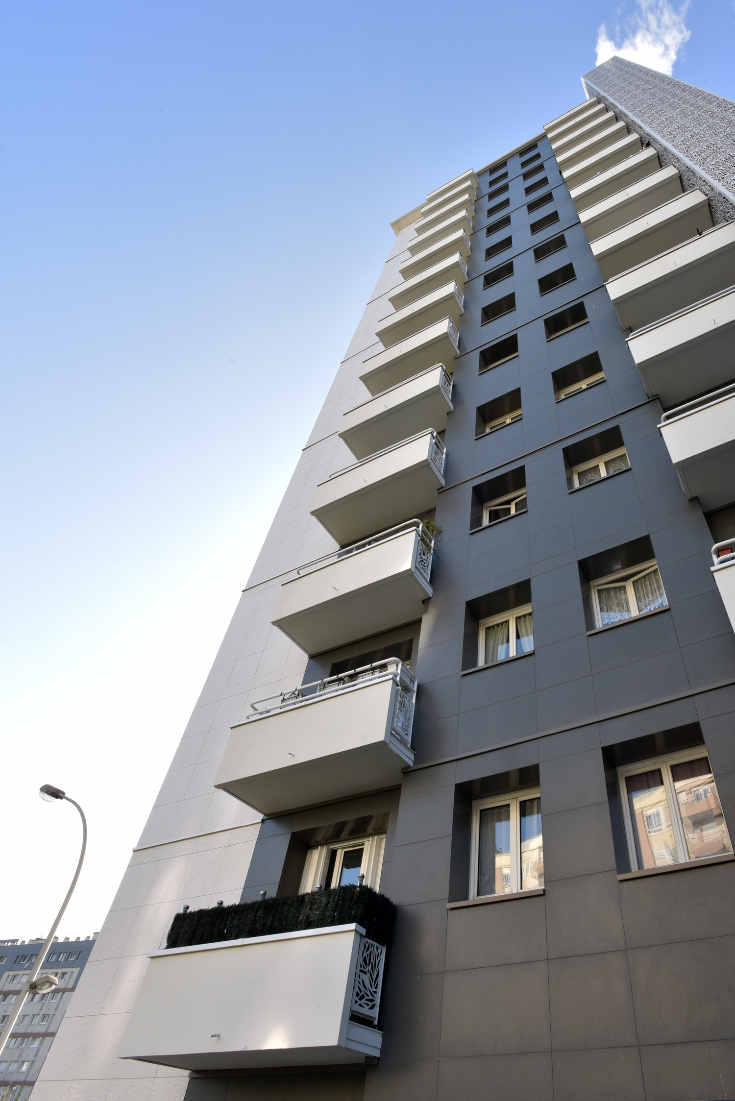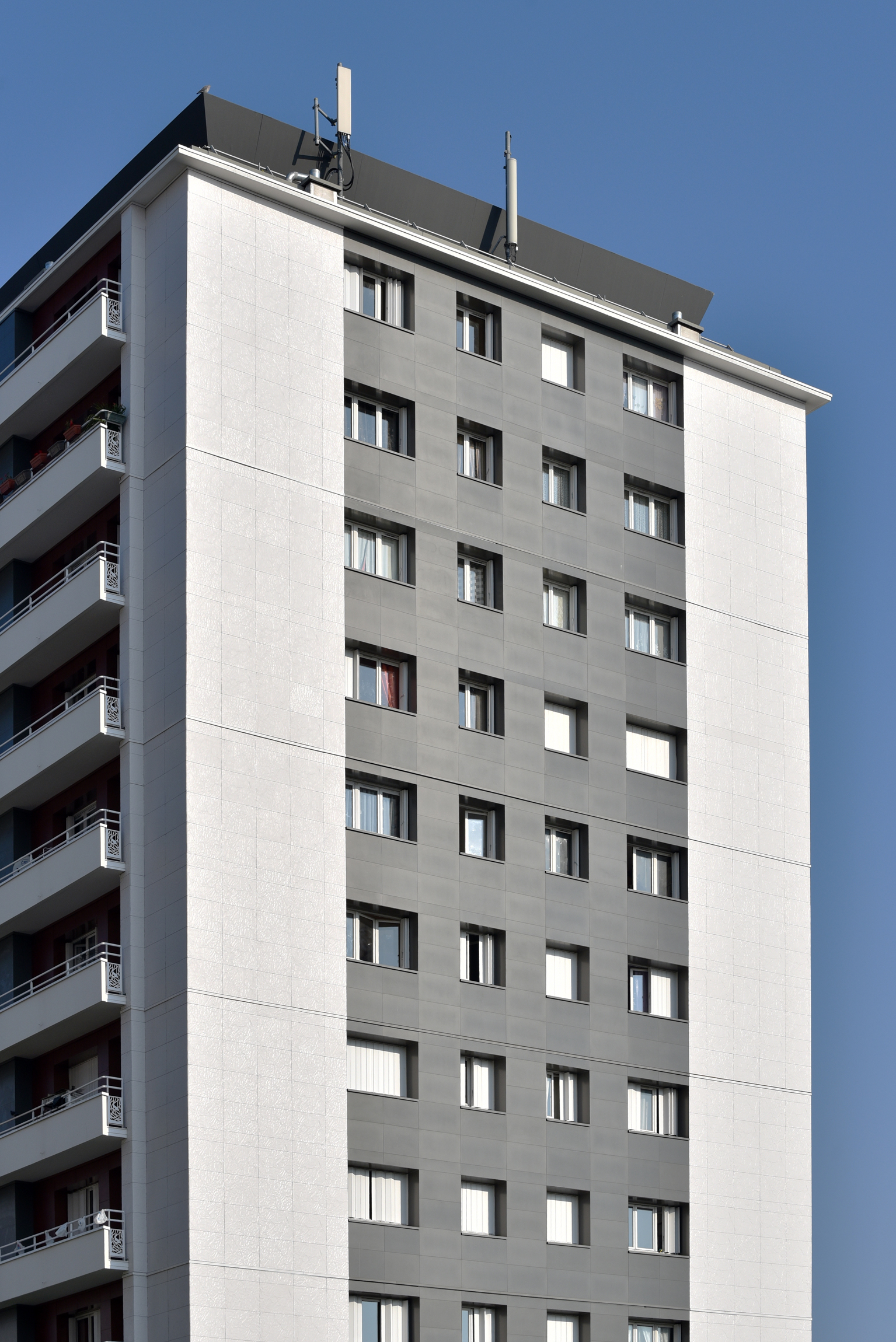 Ce qui est à retenir en matière d’Isolation Thermique par l’Extérieur (I.T.E.), dans le cadre de cette rénovation thermique d’une tour résidentielle, et ce qui caractérise particulièrement ce projet, c’est la possibilité de n’employer qu’un seul matériau et système pour traiter l’ensemble des façades de façon singulière ; ici RHODES (aspect papier froissé) Blanc et LISSE VELOUTÉ Gris basalte, mis en œuvre avec le système de bardage avec ossature CAREA® (BAO).